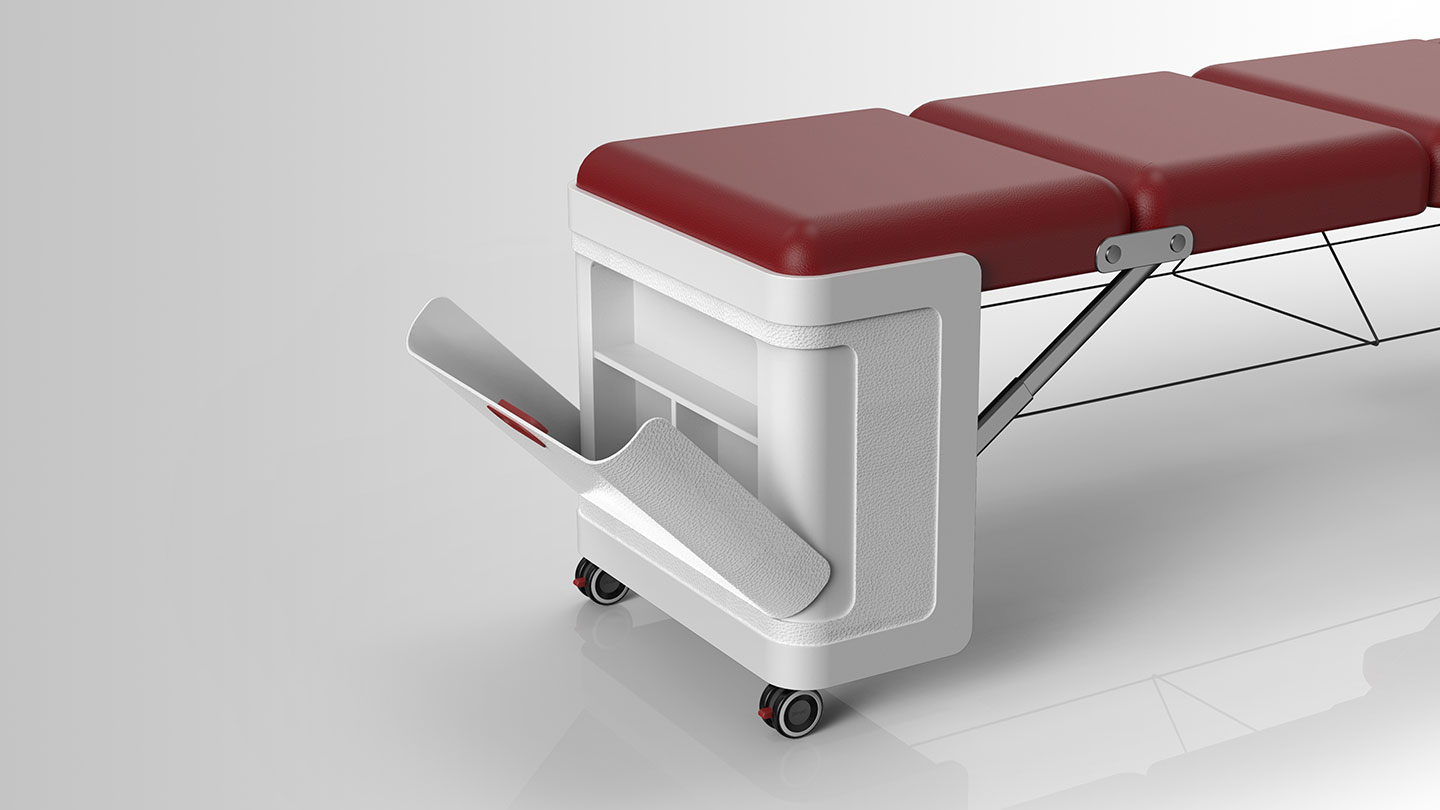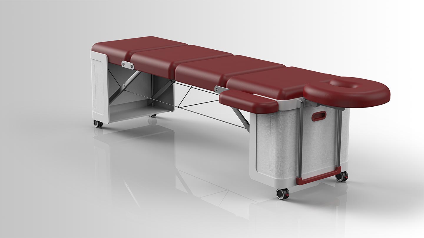 该项目是来自德国客户的委托设计,为其定制研发一款适合欧洲市场SPA按摩服务床,spark独特的结构形式赢得了客户的好评。 便携式折叠按摩床旨在为用户提供舒适、便捷的按摩体验。折叠设计使用空间占比小,可轻松对其进行收纳,方便携带,适合家庭、办公室、客户家中等各种场所使用。同时,床体轻盈,移动滚轮、可伸缩提手设计、行李箱式收纳特点,更便于用户使用过程的移动。床身支撑部分侧方还具有储物功能,提高产品的利用率。