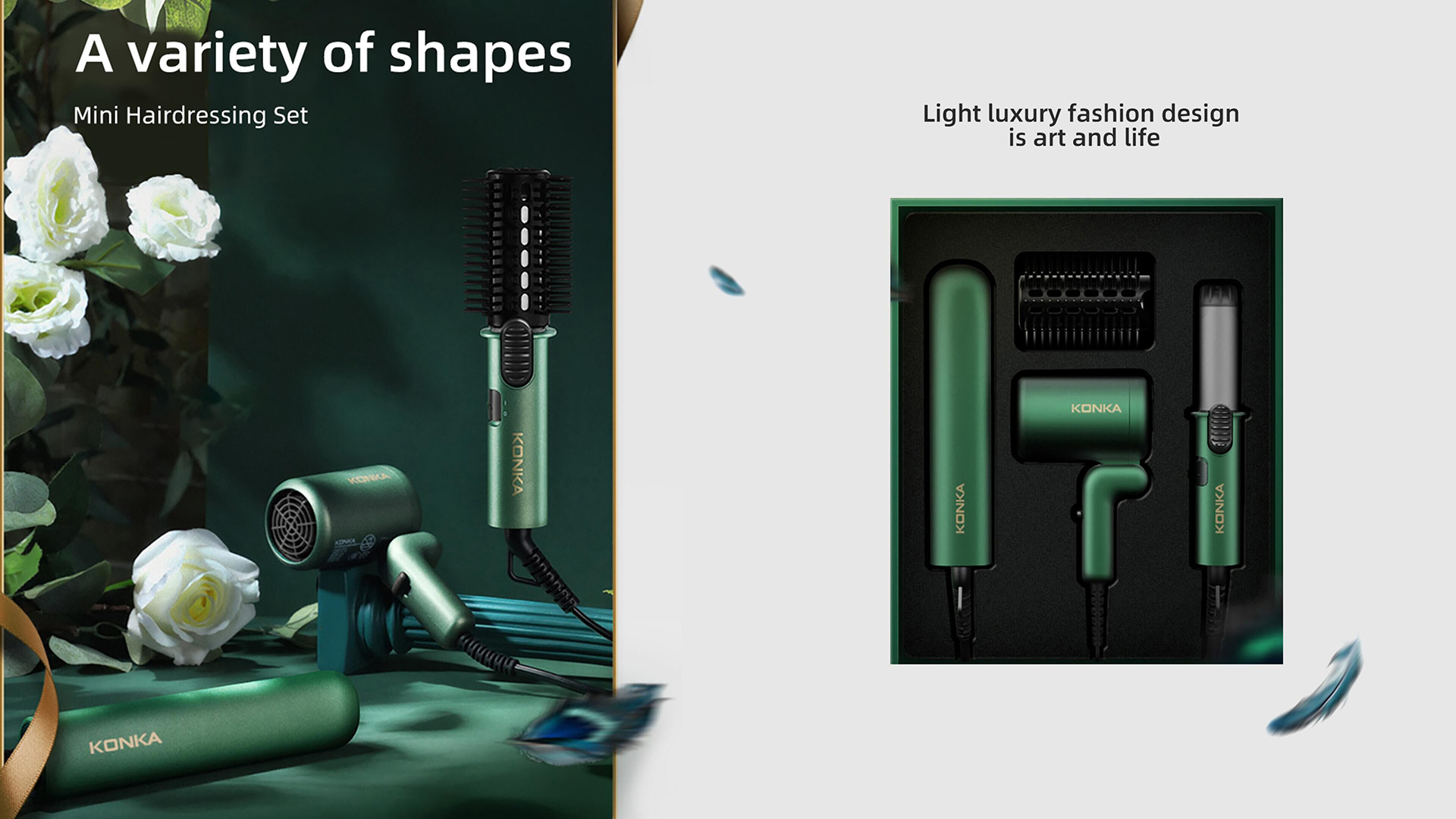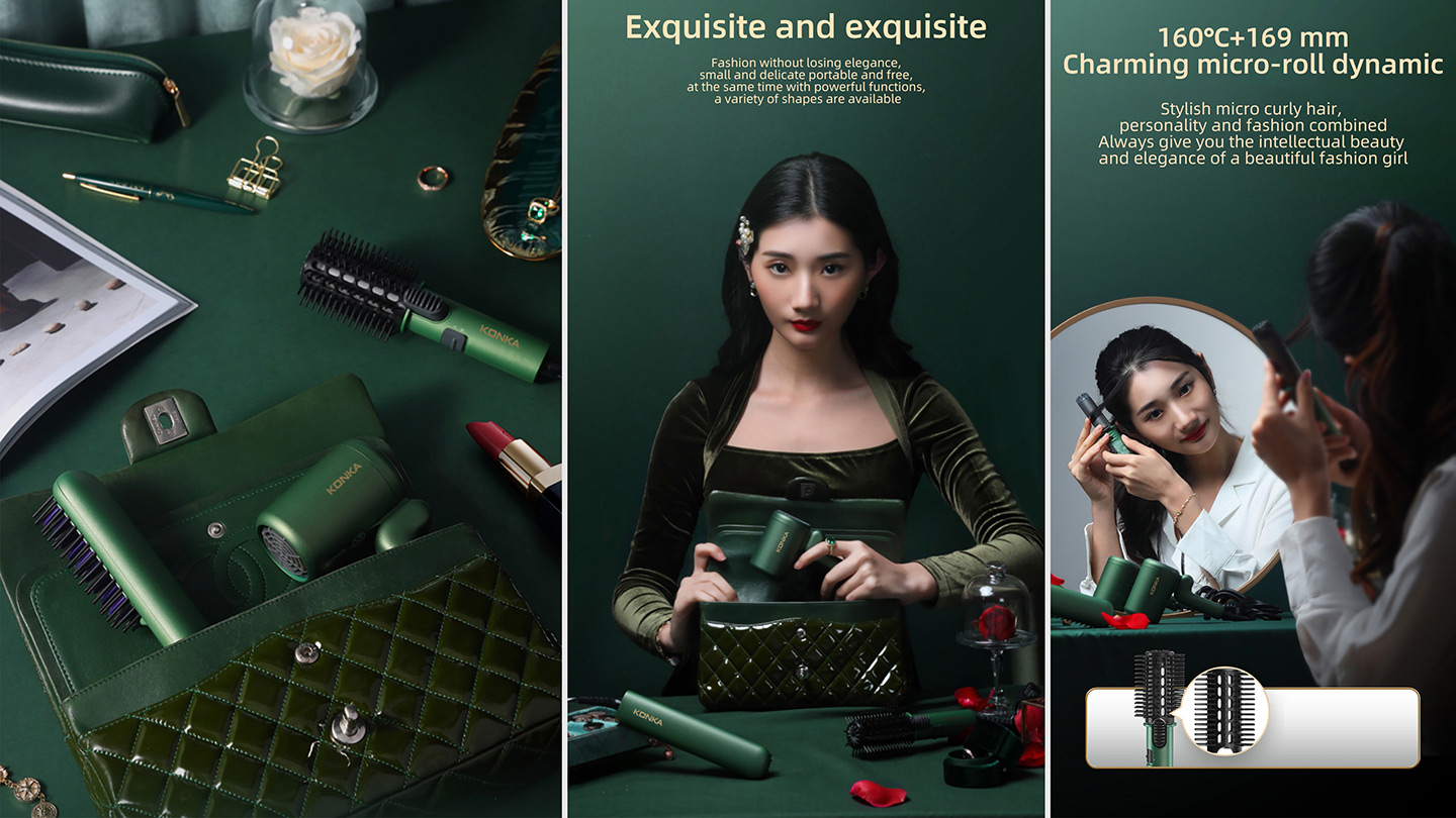 设计打造精致生活,定义轻奢时尚,一眼爱上它,一抹雀绸绿,微哑光泽,让秀发奢养新生。获得国际大奖德国红点设计机构颁发的当代好设计奖。精致小巧型新颖设计,掌心大小,旅游出行、办公会议、小憩休息、轻松打造轻奢华丽造型。电吹风创新的向后可折叠手柄,易携带,恒温快速干发,卷发棒采用防滑手柄,握持舒适;隔热防烫设计,避免烫伤;恒温陶瓷梳头,减少秀发损伤。直发梳采用恒温陶瓷梳头,快速加热,减小秀发损伤。